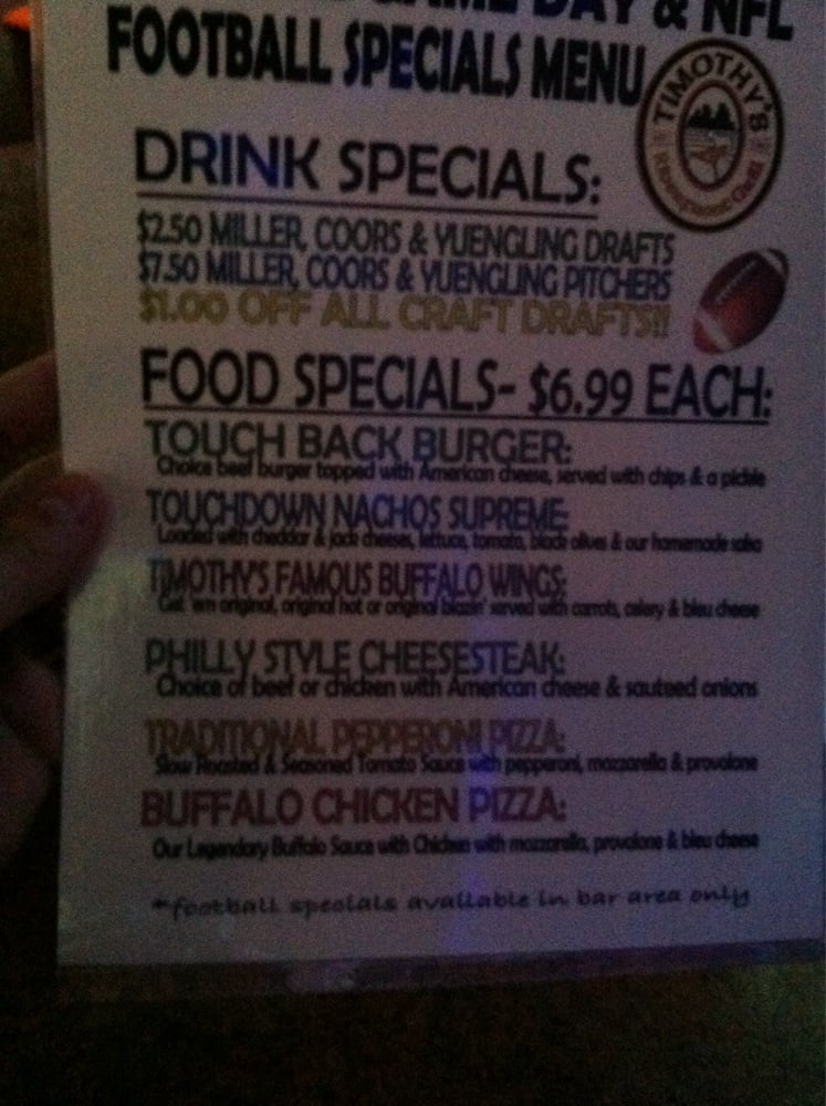Timothys legendary buffalo sauce, grilled chicken and smothered with mozzarella, provolone and bleu cheese crumbles